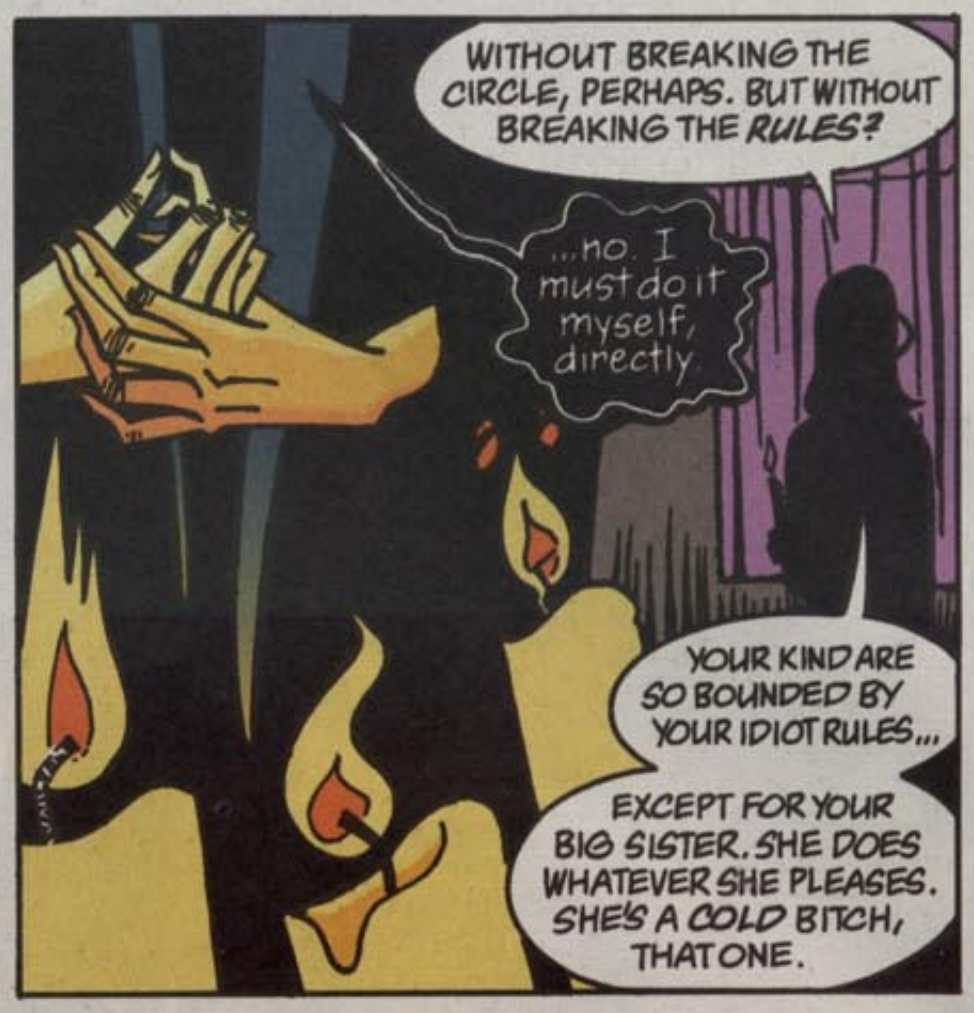 (Which is doubly interesting given that The Sandman is in large part a story about storytelling! Maybe Gaiman on some level recognized that this kind of story gains its power from the interplay between messy non-stories and tidy author-optimized stories; that this is a way for it to keep its soul and humanity, and keep it from becoming one-note in spite of placing an extremely strong focus on a small number of unusually-abstract themes.)