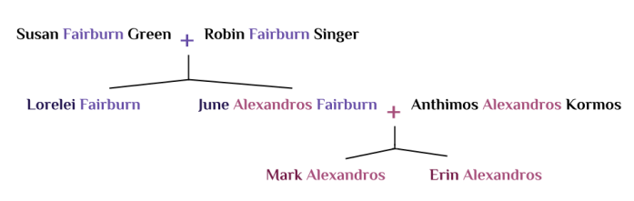 An invented example of how union names work: The Fairburn/Alexandros family tree.